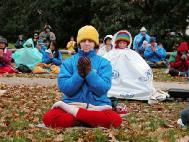 游行队伍中学员们高举许多中英文横幅,包括,“法轮大法好” 、“真善忍” 、“全球公审江泽民” 、“紧急营救受迫害的亲人” 、“停止对法轮功的迫害”等。他们还举着法轮大法在世界各地洪传和在中国受迫害的图片。