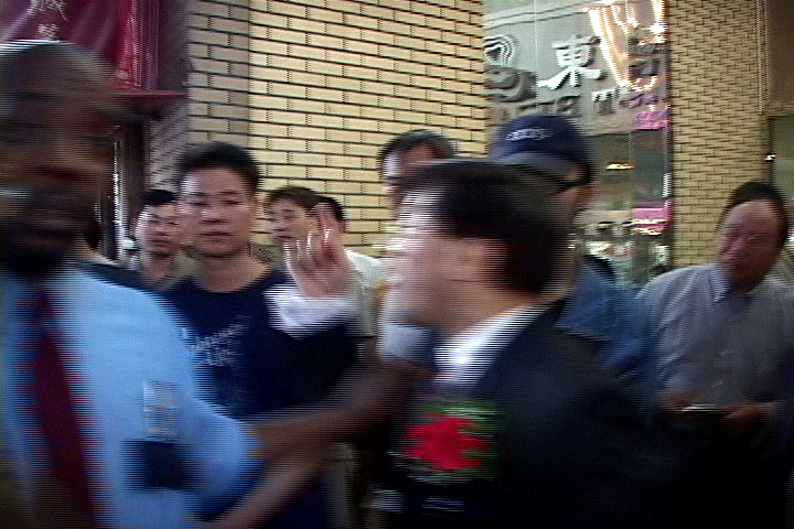 | 以梁冠军为首的一些人将多名法轮功学员打伤 | 花俊雄在谩骂 | 暴徒推搡法轮功学员 |