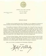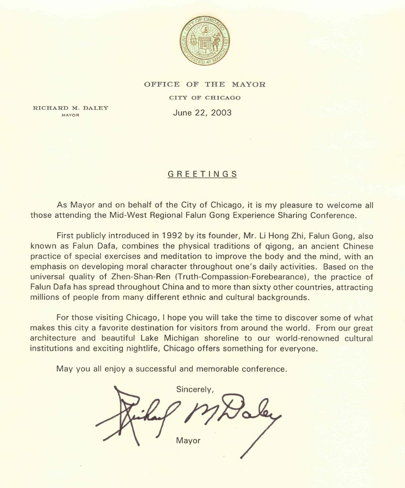 作为市长并代表芝加哥市,我愉快地欢迎所有参加中西部地区法轮功心得交流会的人士。