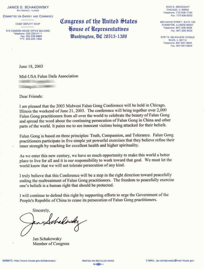 美国会众议员詹尼丝-沙考斯基写信祝贺芝加哥法会