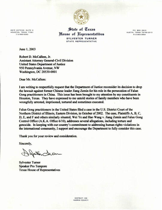 他说,美国法轮功学员于2002年10月向美国伊利诺州北区东署的地区法院递交了一份起诉书。该案原告A,B,C,D,E,F和一些有类似经历的法轮功学员叶薇和汪浩,对江XX和迫害法轮功的机构(亦称610办公室)进行了几项控诉,其中包括酷刑和群体灭绝罪。与我们国家在国际社会上关注人权侵犯的承诺一致,我支持并鼓励贵部全面支持对江的起诉。