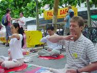 在以后的几个周末我们也将通过我们的摊位让我们的城市──法兰克福的人们了解法轮功的和平的本质。我们向他们讲清中国江氏集团对炼功人犯下的罪行,告诉他们在不同的国家的对江××──制造这场非理智镇压的罪魁祸首──的控告。