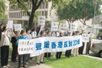 28日中领馆前的示威,由全球反对23条立法筹委会、香港论坛、国际特赦、视觉艺术协会、中国社会民主党美西分部、「中国事务」杂志、中国人权和法轮功学员等主办,到场者约四十多人。他们分别举着反对23条的标语,并戴上口罩,口罩外面打着叉,意味23条立法如通过,香港的言论自由和新闻自由就将受到严格控制,人们不得不闭嘴。