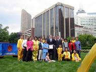 典礼中,副通讯主任周迪先生代表州长前来祝贺并表彰法轮大法所遵循的真善忍原则确能洗涤人心,并引导人类走向一个善良和谐的社会,他们高度肯定法轮功对社区的杰出贡献。