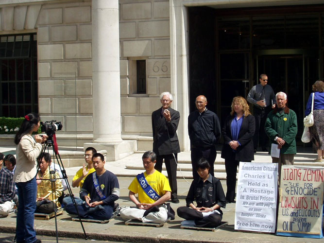 中午12点30分,一位西人学员宣布新闻发布会正式开始。来自古德弗市的海伦·茜彻第一个发言,然后,90岁高龄的法轮功学员,瑟罗勋爵发表演讲,他讲到,这一年的不间断和平请愿是了不起的,因为这是为了抗议已持续4年之久的人类历史上最大规模的,这场迫害是中国政府针对他自己的人民进行的,而这些被迫害的人民所涉的唯一“罪过”仅仅是坚信一个和平的非暴力的精神信仰。最后,他呼吁:“我们呼吁英国所有的人共同加入这一抗议行列,更深刻地理解正在中国发生的邪恶。”最后,法轮功学员罗伯特·基普森代表参与绝食的学员宣读了绝食申明,声援被非法关押在中国监狱、正在绝食抗议的美国公民李祥春医生。