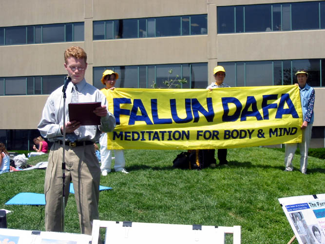 在集会中,西人学员麦克列举了江××在过去的四年中对法轮功的种种严酷迫害,以及李祥春医生今年一月回大陆探亲时在机场被逮捕、后被非法判三年徒刑、继而因绝食抗议而被野蛮灌食的情况。华州居民、法轮功学员瞻女士谈了她于2002年2月去北京时被大陆官方跟踪、抓捕、拷问,并挨打的亲身经历。她呼吁人们用良心来帮助停止这场迫害。
