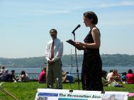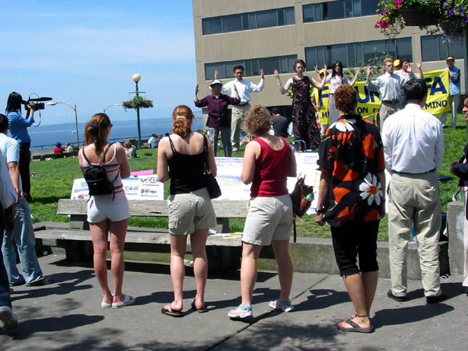 【明慧网2003年6月7日】6月5日星期四中午,美国华盛顿州法轮功学员在市中心Pike Market Place Victor Steinbrueck公园召开新闻发布会,呼吁华州人民用正义、良知和勇气来谴责前中国国家主席江泽民,支持美国联邦地区法庭受理的起诉江××案;并帮助正在南京监狱绝食的美国公民、法轮功学员李祥春医生脱离牢狱,重获自由。