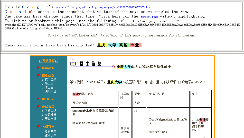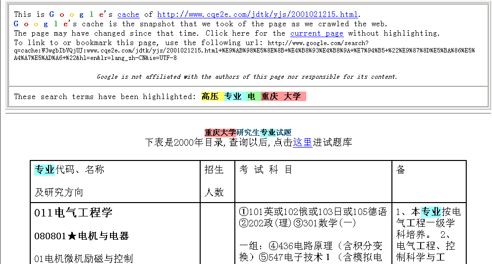 刚刚看了大纪元上有关重庆大学网站删改专业的报道,笔者在重庆大学的网站内的研究生招生简章的word中找到了“高压直流输电及防真技术”专业,为防止重庆大学校方再次销毁证据、删改有关文件,这里提供了在Google上搜索到有关这个专业的三个不同网站的文章,由于Google本身自带的网页快照的强大功能,将网页内容都储存在Google自己的数据库中,即使网站本身删除了有关页面,但在Google的网页快照中仍能找到。