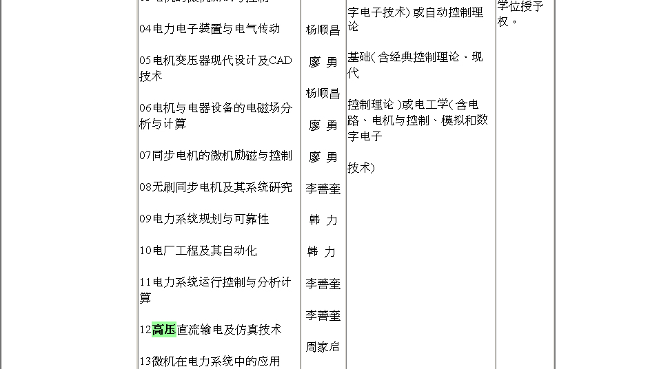 8。打开WORD文件一看,找到电气工程学院,它下面第12号专业,赫然就是“高压直流输电及仿真技术”,导师“牟道槐”。“高压直流输电及仿真技术”这么长的专业名,叫它“高压输电”太合情合理了。重庆大学的学生,说到“高压输电”专业,有多少人会去争论它是别的专业而不是“高压直流输电及仿真技术”专业呢?电气工程学院在发布的公告中否认这个名称,却又在学院自己的网页上不敢让人看到这个专业 (点击系名只是弹出一个空框框啊!),岂不是做贼心虚?