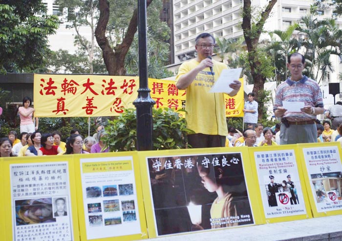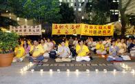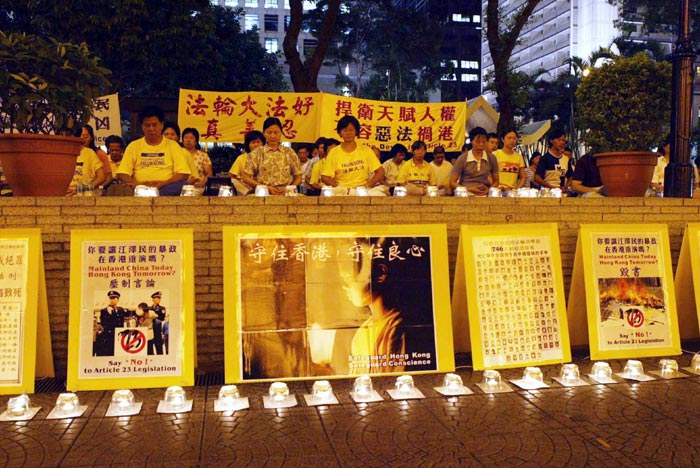 【明慧网2003年7月1日】香港法轮功学员于「七一游行」前夕,在中环遮打花园举行烛光静坐晚会,表达反对《基本法》二十三条立法的意愿。有法轮功学员表示,市民今天上街游行,反映香港人对二十三条很反感;政府漠视民意将严重引致社会分化,成为社会的不稳定因素,对国家和社会都不好。