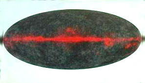 这是整个天空的图象,是整个天空的投影,中间的红线是我们自己的星系,我们星系的平面,三种颜色对应着三种频率,天体微波的背景是黑白的背景,这些一团一团的东西是宇宙非常非常早期的结构。