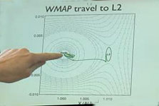 卫星首先在这个轨道上,围着地球转了3圈。这是月亮的位置,月亮走非常椭圆的轨道。我们利用月亮把卫星推出去,推到一个叫L2的太阳地球系的拉格朗极点。太阳的位置在很左边,一百倍于这儿的距离,这是一个地球 ─ 太阳系统中的稳定点,卫星就在这里工作。选在这里的原因是太阳、月亮、地球在一个方向上,所以我们不会有太阳、月亮、地球的热量和能量的影响,它们在后边。