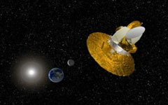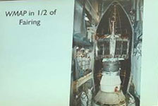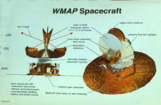 WMAP太空船有六千公斤,它在地球的轨道以外飞行,这是一张图。这两个望远镜朝着两个方向,测量天空两个不同方向上的温度差。它每两分钟转一圈,所以,随着时间,整个天空的不同部分都算出了这个温度差。