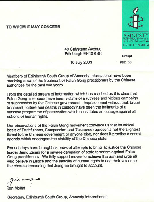 国际大赦英国爱丁堡分部支持法轮功学员诉江案的声明