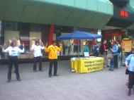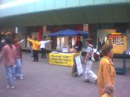 当一部分学员炼功时,另一部分学员发传单并回答行人的问题。