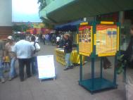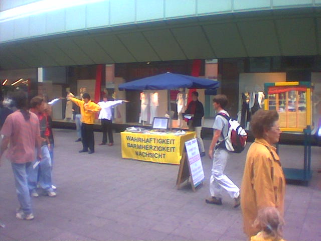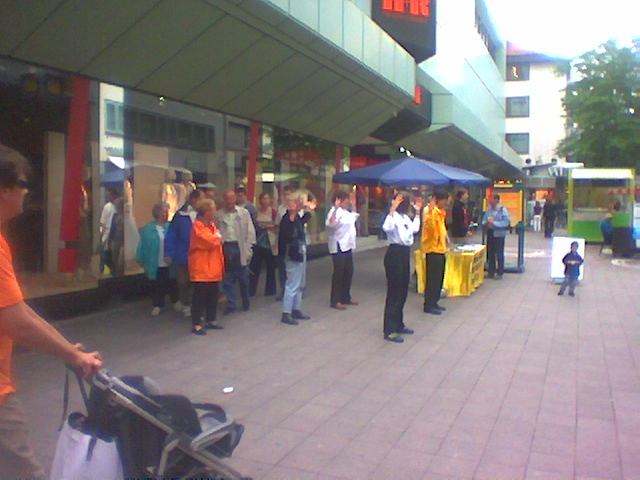 【明慧网2003年7月15日】上周六,我们在Darmstadt市举办了一次信息日活动。我们向该市市民和参加集市的人们讲述了关于香港第23条和江××因群体灭绝罪被告上法庭的情况。我们做了两个展板,分别贴在一块竖板的两侧。很多人到我们这里来,展板很显眼,所有人都能看到它。