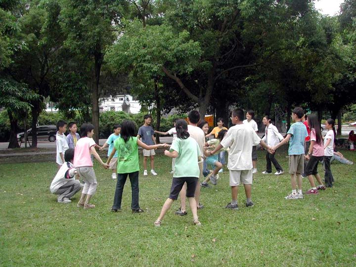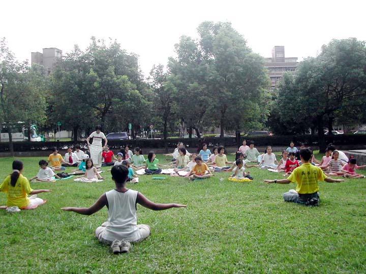 待大伙儿游戏兴致稍微缓和后,小弟子们排好炼功队形准备炼功,炼功音乐一响起,五套功法接着炼,动作缓、慢、圆,场面一片祥和。虽然五套功法只炼一个钟头,但对很多小弟子而言已算是难得了。
