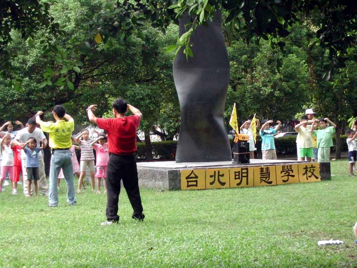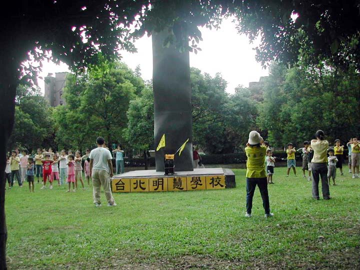 炼完五套功法,小弟子们再次大声地念十分钟「洪吟」,然后就展开今天的参观活动,各小组由小组长各自带开进入士林官邸参观。据官邸工作人员告知,每逢星期六、星期日在官邸有导览员为民众提供免费导览,有几组小弟子刚进入官邸时,正好遇上导览员开始要进行导览,辅导员向他表示我们都是法轮功学员,趁着暑假特地带了一群中小学生也是法轮功学员来参观士林官邸,导览员表示非常欢迎。