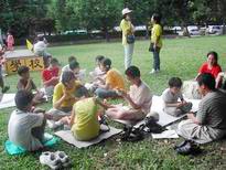 傍晚六点发正念后,圆满结束一天的户外学法、炼功、讲清真相暨参观活动。所有小弟子及辅导员合照一张照片后大家互道一声再见!