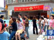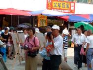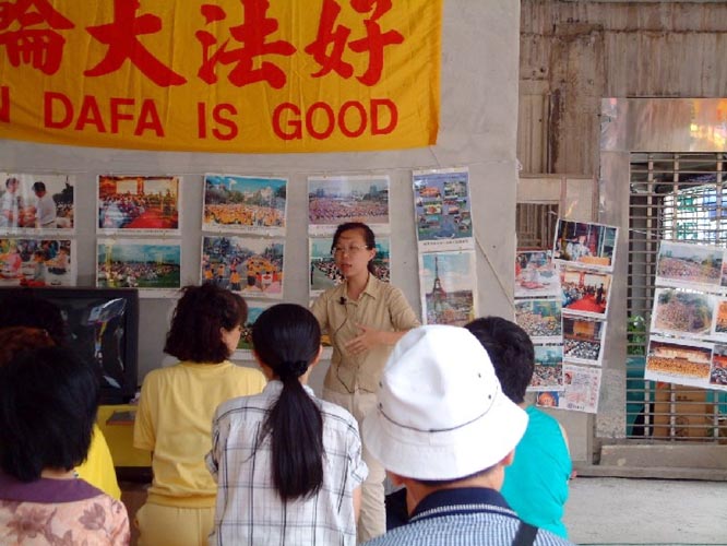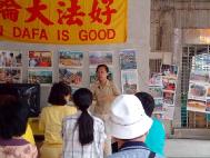 热闹的小街各式小吃香气四溢,叫卖声不断。法轮大法的展位中,学员们静静的和着优美的炼功音乐炼着功,吸引了来往的人们驻足观看,将展位整个围了起来,真是一副动中有静的绝妙景观。有的人说:“我很早就想看法轮功全套功法了,一直没有机会,今天终于看到了!”;也有很多人表示一直想多了解法轮大法,并仔细地看起真相图片来。在人群中移动的人们远远看到我们的展位,纷纷禁不住叫出声来:“法轮功!”,脸上那种表情真是比炽热的阳光还要热烈;有的家长甚至边走边向孩子解释,在中国江政府是如何暴力打压法轮功、迫害人权的……这些数不清的感人画面,让学员从内心感动,感谢师尊慈悲眷顾每一个生命,感动全世界大法弟子一点一滴的心血收到了成效。