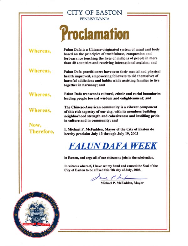 因此,我,伊斯顿市市长麦克尔.P.麦克法登,现在宣布2003年7月13日至19日为伊斯顿市: