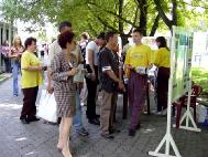 一个中国留学生向我们走来,他为自己和他的同学拿了许多中文资料,在他发给其他同学时,一位法轮功学员用中文向他们打招呼,他们报以微笑。看得出来,他们拿到真象报纸都非常的高兴。