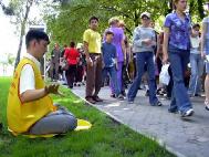 一位男士带着孩子详细询问了许多关于功法和在中国出现的镇压。在结束交谈后,就在他离开时,他对着自己的儿子说:“看见了吗?这些人在干一件多么好的事呀!”