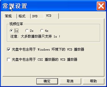 比较一下与一般的VCD 片有什么不一样呢?前面四个黄颜色的文件夹是每个VCD片都有的。“AUTORUN.INF 安装信息”是系统自动加进去的,可以不用管它。“VCD播放器”则需要设置一下:有一个“扳手”图案的按钮,就是用来设置用的。点按一下,弹出一个对话框。按一下“常规”按钮,选中 PAL前面的圆圈;再依次按“格式”按钮,选中 VCD;再接着按“VCD”按扭,视频位率一栏选中“1X”,再选中“光盘中包含在 window 环境下的VCD播放器”即可。