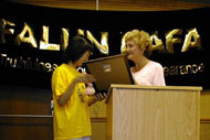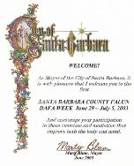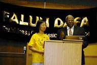 美国加州圣塔芭芭拉县“法轮大法周”庆祝仪式于6月29日隆重举行,国会议员洛伊斯--卡普斯女士的代表和圣塔玛丽亚市市长拉里-拉瓦格尼诺先生的代表为法轮大法褒奖。两位来自洛杉矶的大法学员分别表演了舞剑和二胡独奏,许多正在图书馆看书的读者也被悠扬的音乐吸引而来到庆祝会场。