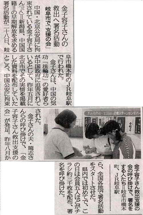 【明慧网2003年7月2日】为了要求被中国北京市公安局关押的居住于新泻县的金子容子女士(中国籍)早日获得释放,[6月]28日在岐阜市桥本町的日本国营铁路岐阜站举行了征集签名活动。