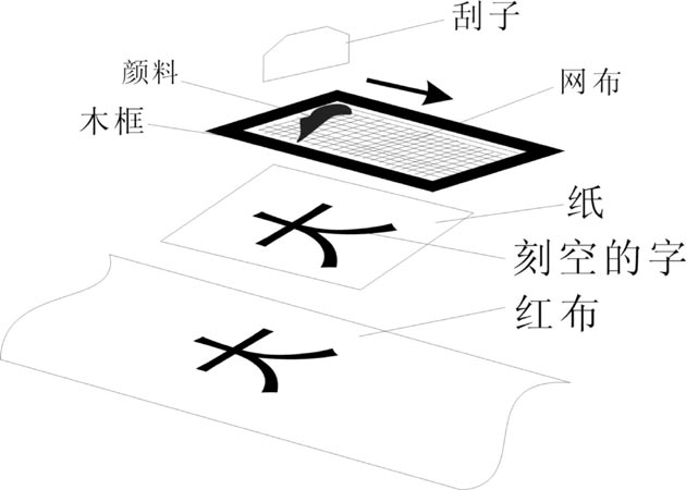 材料:木框、筛网布、刮子、纸、颜料或用乳白胶加蛋黄粉替代或用聚乙烯醇厂有售)以1:8水煮至透明加蛋黄粉替代。