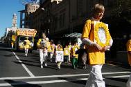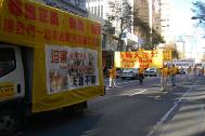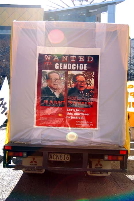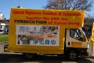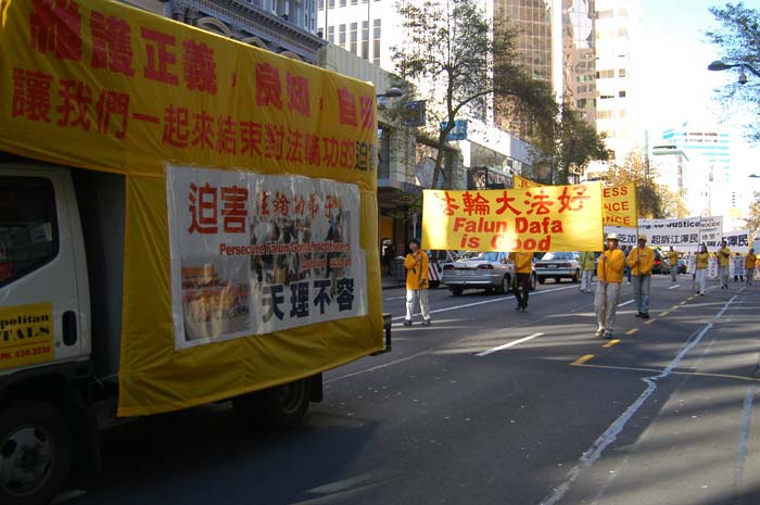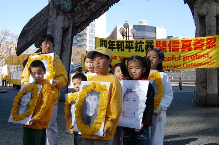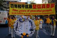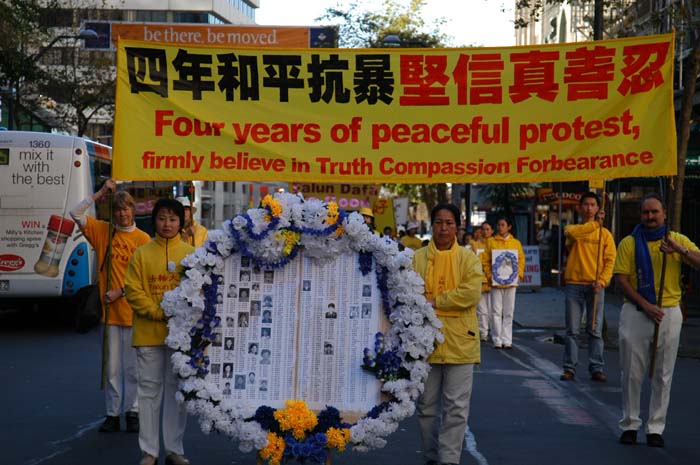 7月20日的游行队伍中,队伍前头是一个巨大的花圈,内嵌四年来被迫害致死的法轮功学员名单、照片,醒目地向人们倾诉着中国法轮功学员所遭受的残酷迫害,整个游行历时1小时。