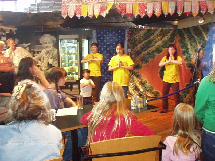【明慧网2003年7月21日】7月19日,苏格兰邓迪市的大法弟子应邀参加了邓迪市政府及利普剧院共同举办的艺术节表演。我们刚一到,就有人指着我们的印有法轮大法的上衣笑着打招呼说,“哦,法轮功,我们正在说你们呢?什么时候开始表演?”我们的功法表演被安排在第一个上场。当普度的音乐响起,整个大厅笼罩在一片祥和之中。有一个才3岁半的大法弟子一丝不苟的从头炼到尾。她那认真可爱的样子吸引了无数的目光。功法表演在热烈的掌声中结束。不断地有人伸出大拇指,向我们表示祝贺!大法弟子满怀对众生的美好祝愿,离开了会场。