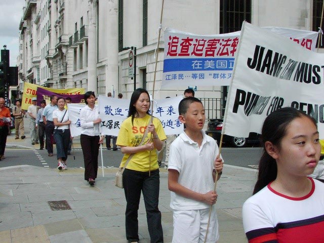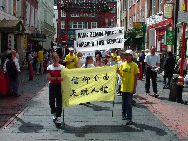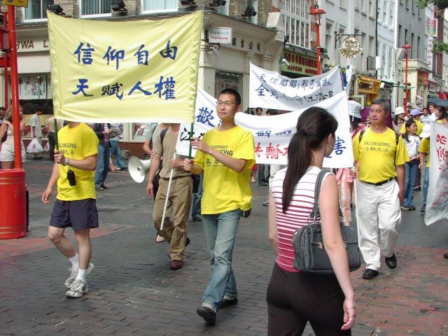 【明慧网2003年7月21日】2003年7月20日,部分英国法轮功学员在伦敦中使馆门前举行新闻发布会,呼吁停止在中国大陆对法轮功已持续四年的残酷迫害。会后围绕伦敦市中心,特别是中国城的游行,受到广泛关注,人们纷纷驻足观望,许多人主动上前索取资料。