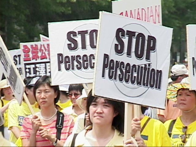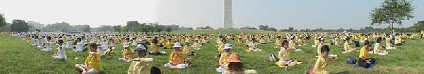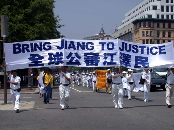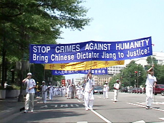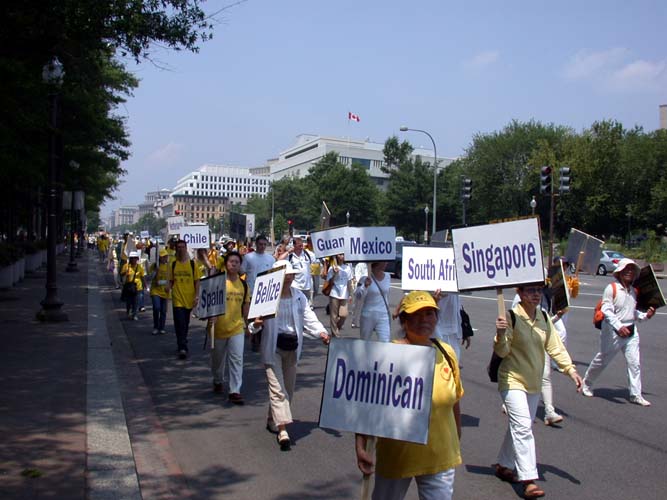 【明慧网2003年7月22日】7月21日中午,来自世界各地60多个国家的三千多名法轮功学员代表在华盛顿举行大规模游行,要求把迫害法轮功的主要责任者、前中共总书记江泽民送上法庭,呼吁全世界善良的人们关注法轮功在中国受到的镇压,共同制止这场建立在谎言基础之上的人权迫害。