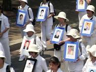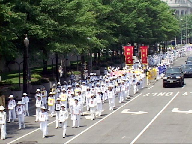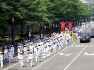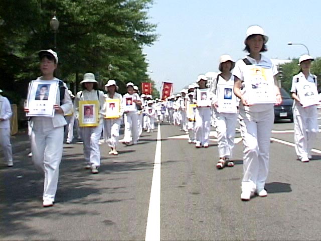 据大纪元新闻网报道,21日中午11时30分,游行队伍由警车开道,浩浩荡荡走上了宾夕法尼亚大道。队伍的最前面是三幅巨大的横幅,上面用中英文写着「停止人权迫害,把独裁者江泽民送上法庭」、「世界需要真善忍」、「反人类群体灭绝 江泽民罪责难逃」,随后是由身着素装的一百多位女学员组成的方队,她们手捧着在大陆被迫害致死的学员的遗像,缓缓地走着,向人们无声地诉说着中国大陆法轮功学员正在遭受的残酷迫害。来自不同国家、不同民族、不同肤色的法轮功学员们举着各种横幅标语、真相图片,他们没有口号,没有喧哗,平和中透着坚定,让人们感受到法轮功学员和平的力量。