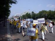 本此游行的组织者之一戈敏介绍,每年的7月20日,各地法轮功学员都会聚集到华府,呼吁维护正义良知,支持受到不公待遇的中国法轮功学员,而且来的人一年比一年多,今年有60多个国家的5000多名法轮功学员来到华府,是人数最多的一次。