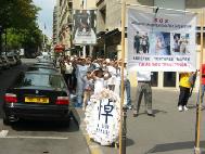 继19、20日两天的游行之后,21日下午,来自法国各地的大法弟子在中使馆前举行活动,抗议江氏政治流氓集团四年的血腥迫害,向法国社会各界讲真象破除谎言与迫害,呼吁全社会支持公审江泽民。