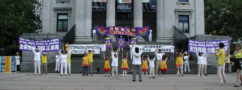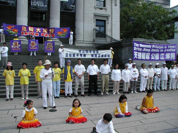 法轮功学员在艺术馆前阶梯的上面拉开了“法轮大法好”的大型横幅,顺势下来,三名学员端持“真善忍”。在阶梯下面,中英文 “天理昭昭 公审江泽民”、“停止四年迫害 正信坚不可摧 唤醒正义良知”等横幅无不在向世人展示,法轮功学员在经历了四年的被残酷迫害后,已经变得更加坚定、成熟、理性。