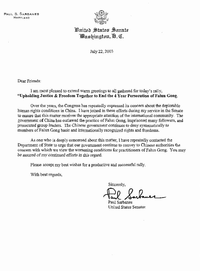 美国联邦参议员萨班斯祝贺「主持正义与自由,停止对法轮功迫害 」集会成功