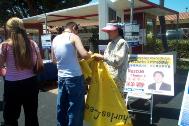 星期六,位于佛利蒙市政厅附近的街道上人群熙熙攘攘、热闹非凡,刚开始发材料时,人们并不是很积极的接材料,可是当他们一听到是法轮功,马上高兴的接过材料,有的并主动索取材料并签名。人们纷纷在为营救李祥春的请愿信上签名,呼吁美国政府敦促中国政府立即释放李祥春。