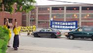 驻纽约总领事张宏喜波士顿告别宴会由原定的公开活动改为麻省理工学院宿舍楼内的私人聚会。这是楼外的法轮功学员在路边默默地举着各色横幅和标牌。