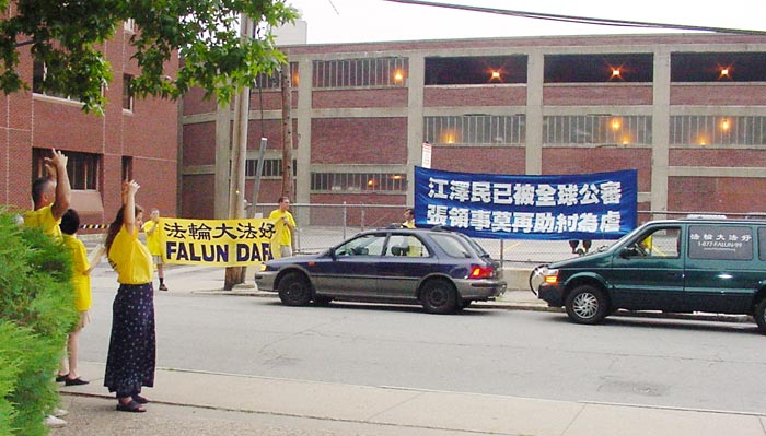 【明慧网2003年7月31日】7月27日,中国驻纽约总领事张宏喜波士顿卸任告别会分别在纽英仑中华公所和在麻省理工学院院内举行。数十名当地法轮功学员来到会场外请愿,要求中领馆停止在海外散布对法轮功的谎言和诬陷,停止分裂海外大陆同胞得之不易的和睦环境。