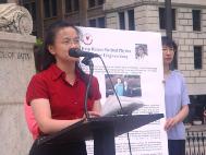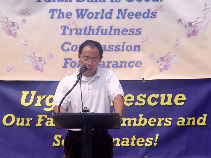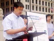 特地从辛辛那提赶来参加新闻发布会的一位辛辛那提大学的博士生尽管虽然本人不是法轮功学员,也勇敢地站出来呼吁人们营救他妻子的哥哥王为宇。王为宇是一名优秀的清华大学的博士生,因为学法轮功被迫退学,于去年8月被警察逮捕,至今下落不明。
