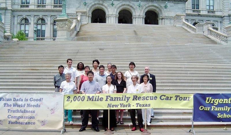 【明慧网2003年7月5日】6月27日星期五的中午,在奥本尼市纽约州府大楼东花园的大台阶前,举行了“2000英里汽车营救之旅”启程的新闻发布会、集会及征签活动。苟北和吴雪原博士夫妇从这里开始了他们长达两千多英里的营救亲人汽车之旅。