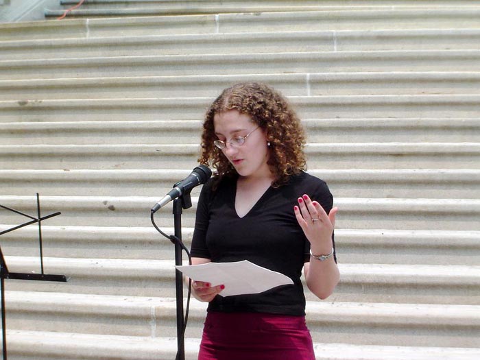 雷切尔-浮丝(Rachael Fauss)在讲话中说,在听到吴雪原博士的故事之前,她还没有意识到这场迫害竟是如此近地就发生在身边。她强调说我们能生活在这样一个自由的社会是多么的幸运,我们必须尽可能去帮助那些没有这么幸运而且正遭受着迫害的人们。