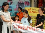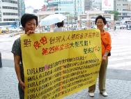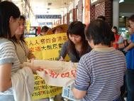 | 对台中火车站的来往民众展示反对23条的海报 | 小学生经由妈妈的解释,也签下名字支持人权 |