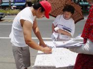 大里花市的征签活动从6日一早持续到中午过了12点,炎炎烈日下征签人员冒着满头大汗热心的为来往民众解说香港23条立法对民主国家的人民人权的影响,吸引了许多民众停下脚步,并热情回应签下他们的名字。也有见义勇为的民众说:「这个要签,一定要签的!哪有那么不合理的立法,怎么可以让它通过!」