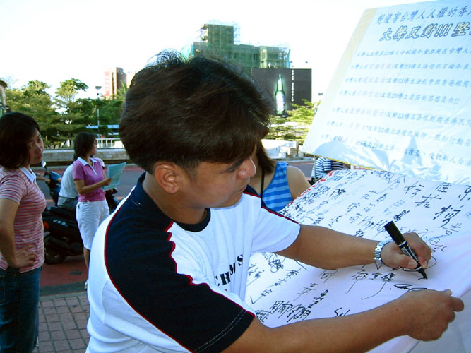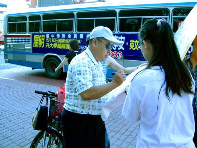 整个一个半小时的活动都在一片非常祥和的气氛下进行着,学员们分工合作,有在烈日下发真相资料的,有静静地伴随着音乐炼功的,有不停地讲解征得签名的,也还有学员耐心地将征签布条耸立在人行道上,方便行人签名。民众透过这次征签活动,看到了大法学员表现出来的真、善、忍,不仅了解了反对香港23条立法的意义,也从中国江政府迫害法轮功的真相图片中看到了迫害人权的残酷及制止恶法的重要性。很多人透过在布条上签下了自己的名字,表达了反对恶法的正义感和对善良人们的支援。