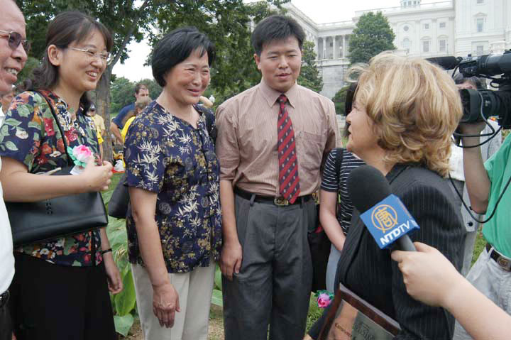 7.22日,陈刚全家参加华府法轮功大集会。图为陈刚全家向美国国会议员Ross致谢,感谢议员对法轮功学员营救亲人活动的支持。